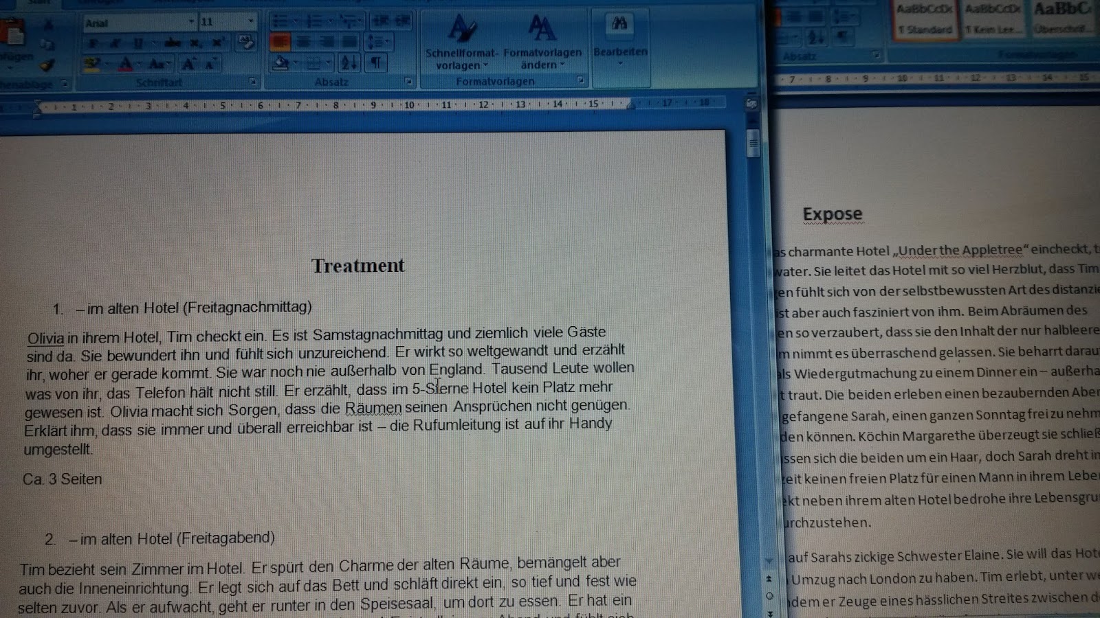 Den Nachmittag über habe ich mich dann mit Treatment und Exposé beschäftigt. Zu meiner Überraschung kam ich zu der Erkenntnis: Das hilft wirklich im Schreibprozess!